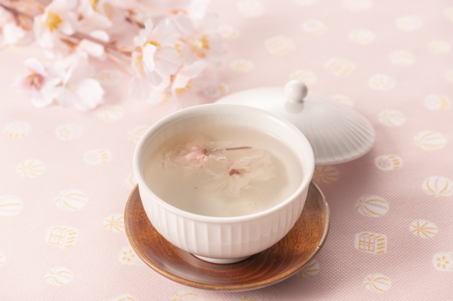塩と梅酢で漬け込んだ桜の花びらに熱湯を注いだ、上品な香りと